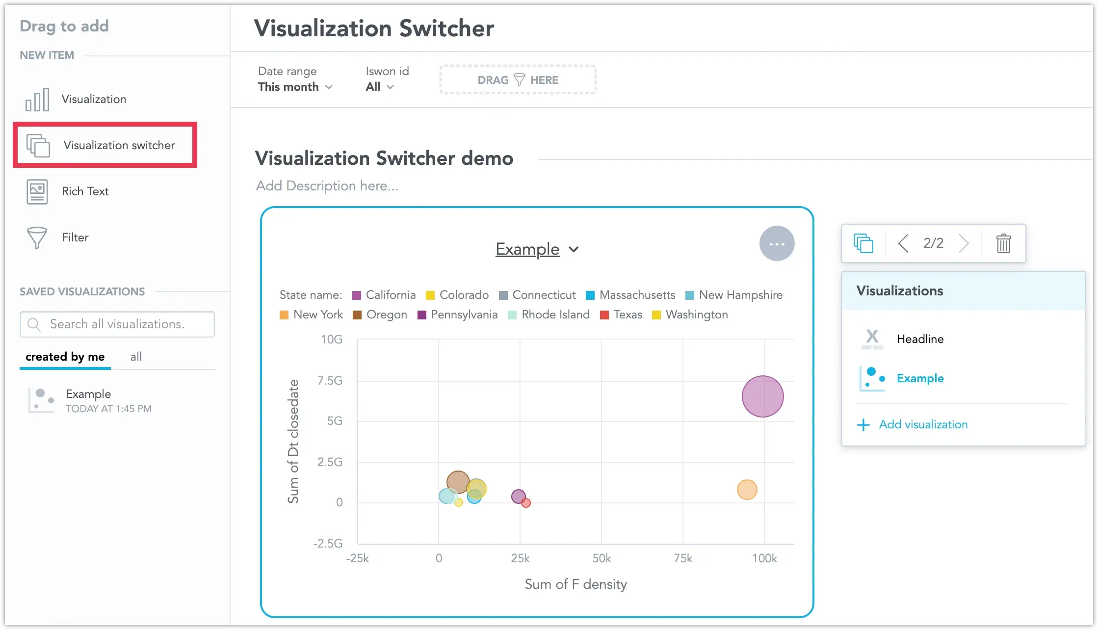 Custom Layout: Easily drag, drop, and resize visualization switcher across a 12-column grid for responsive layouts.